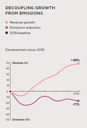 Since our baseline year 2019, we have reduced greenhouse gas emissions across our value chain by 17% while growing revenue by 49%, maintaining focus on halving emissions by 2030 and demonstrating a clear decoupling of business growth from emissions.
