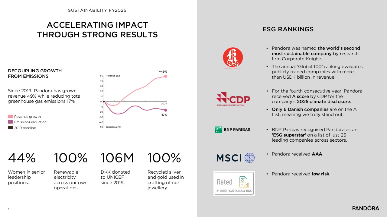 Pandora sustainability targets offer us the opportunity to improve our sustainability performance, while also increasing our resilience and making us more attractive in the market place. Highlights below are based on information in our Annual Report 2025.