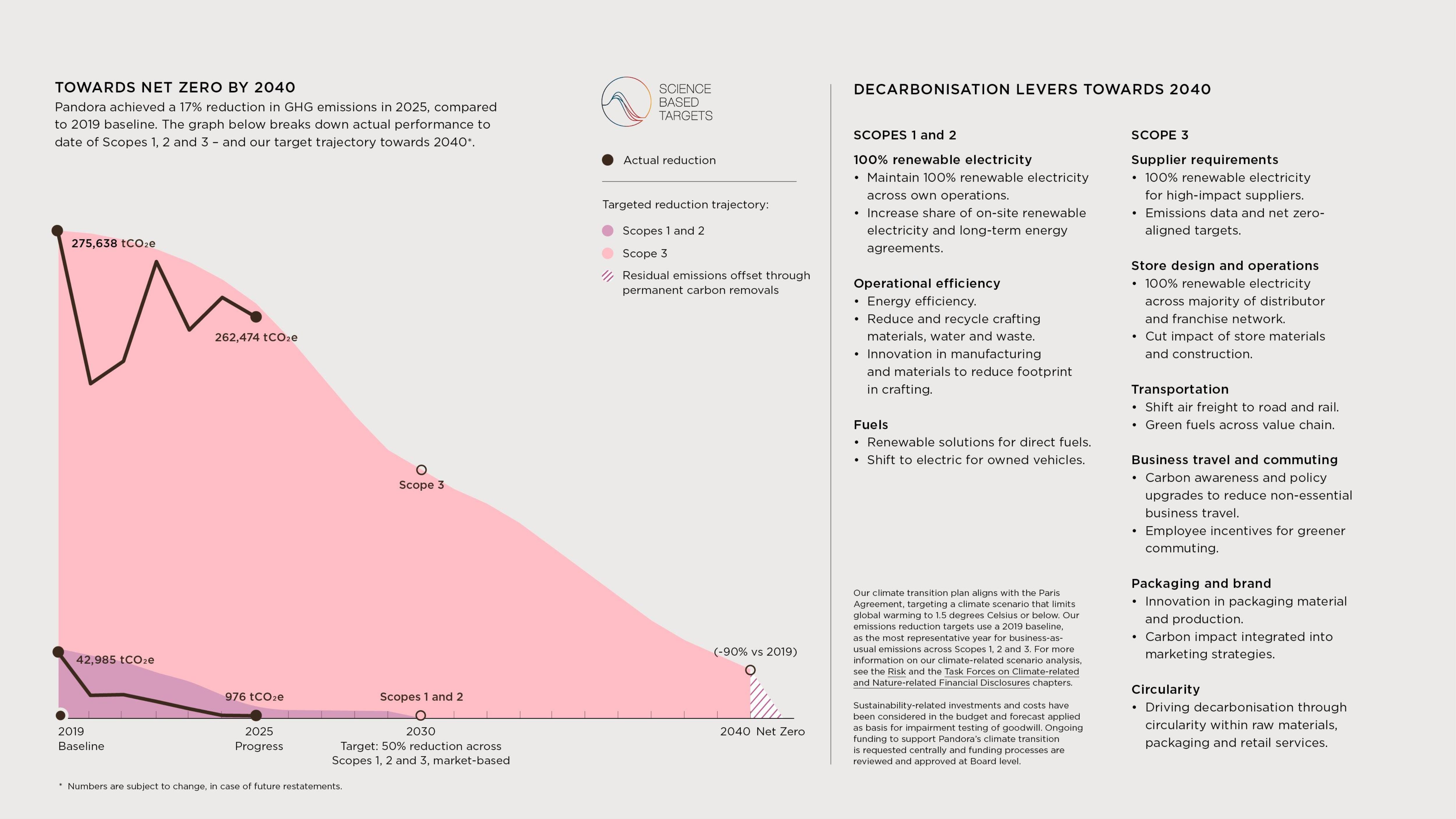 In 2025, Scope 3 emissions decreased by 5% from 2024, due to expanded renewable electricity coverage, less business travel and optimisation efforts. Among others, this included air-to-ground transition and value engineering of store displays and trays. We continue to focus on supplier capacity-building initiatives, including e-learning training on key sustainability topics and low-carbon clauses in supplier contracts which encourage emissions reporting and reduction.